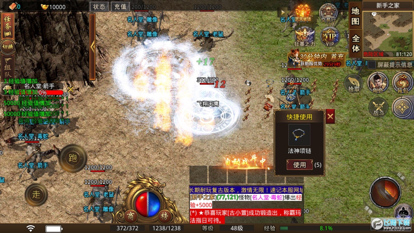 火龙秘境等地图爆率拉满,小怪也有几率掉落顶级神装,打宝不墨迹,上线即有收获,适合上班族与怀旧党。