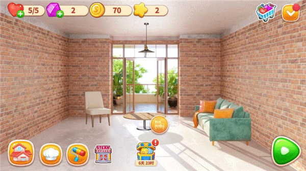 除了餐厅经营,玩家还可以点击进入“主别墅”界面,利用赢得的金币进行家装。游戏提供了现代简约、田园风、欧式奢华等多种主题的家具与装饰元素。玩家可以自由搭配房间的墙纸、地板,甚至在庭院中摆放雕像、喷泉。这种高度自由的定制选项,让玩家能够打造出一个完全符合个人审美的温馨家园,同时也作为游戏进度的一种可视化奖励,激励玩家不断挑战更高难度的烹饪关卡。