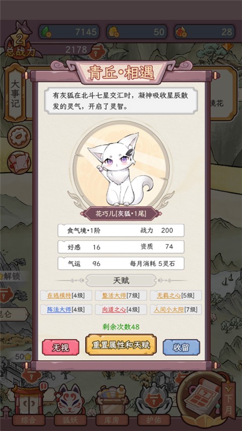 收集图鉴多元:收录数十种狐妖,分地域、性格、外观,可收集稀有狐妖,解锁全图鉴,满足收藏欲。