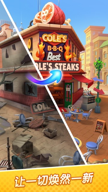 游戏在视觉呈现上极具冲击力,起始于一片焦黑断壁的废墟,随着玩家不断完成订单、赚取资金,原本破败的餐厅逐渐焕发生机。从修复桌椅到装饰墙面,从解锁新的功能区域到让整条美食街重新飘起烟火气,这种“从无到有”的建设过程能给玩家带来满满的成就感。同时,帮助小镇上的其他居民修复他们的餐厅(如老面包店、街角咖啡馆),不仅能解锁失传的私房菜谱,还能见证整座小镇从萧条走向繁华,情感共鸣强烈。
