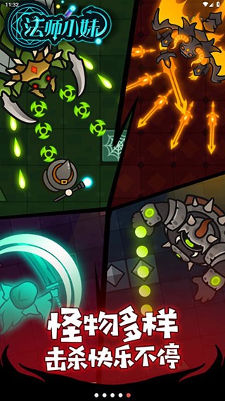 法师小妹是一款将弹幕射击的紧张刺激与放置挂机的轻松休闲完美融合的地牢冒险手游,它用华丽的魔法特效、精致的立绘以及深度的角色养成,让玩家在指尖的灵活走位中,体验一场既解压又充满策略乐趣的魔法少女救世之旅。