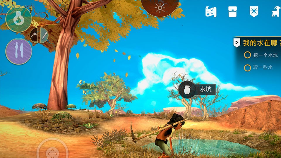 移动与互动:通过屏幕左侧的虚拟摇杆控制角色移动,靠近可互动的物体(如植物、水源点、宝箱)时,屏幕上会出现互动按钮,点击即可进行采集或调查。