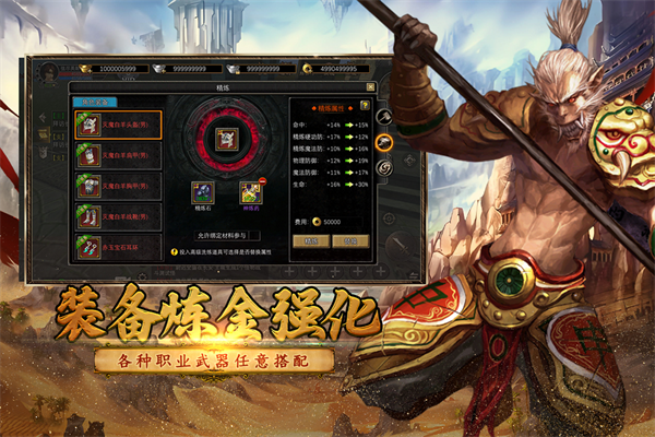 装备养成:通过世界BOSS掉落、秘境探索等途径获取装备,并利用九转炼器、淬玉、宝石镶嵌等系统进行深度强化,打造独一无二的专属神兵。