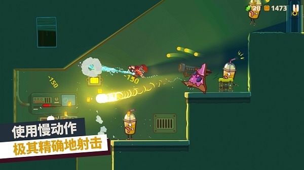 游戏最大的特色无疑是其独创的“弹性战斗系统”。玩家只需一根手指,通过触摸并拖动主角杰克,即可划出一道抛物线轨迹,松开手指后,杰克便会如弹弓般弹射出去,并能粘附在任何表面。这一机制彻底颠覆了传统横版游戏的移动方式,带来了前所未有的流畅感与自由度。更妙的是,在跳跃过程中,玩家可以随时触发“子弹时间”效果,让周围的一切动态瞬间变慢。这不仅让你有充足的时间来调整方向、规避密集的枪林弹雨,更能精准地瞄准敌人的弱点,体验一把置身《黑客帝国》矩阵中的超凡枪战。