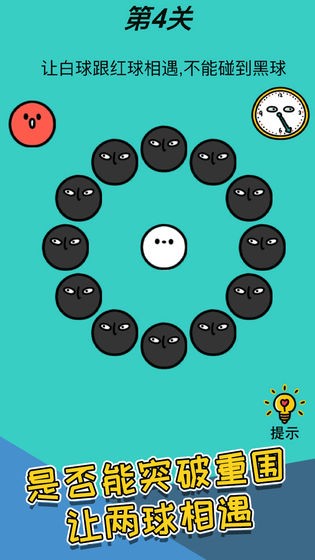 这一关的目标是让白球与红球相遇,同时避开黑球。常规思路可能是控制白球移动,但真正的解法往往是打破常规。根据提示“是否能突破重围”,玩家需要尝试拖动或点击黑球,将其移开或消除,为白球和红球的相遇创造路径。