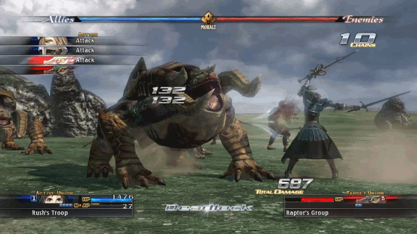 士气系统:这是战斗胜负的关键变量。士气受连击、击杀敌人、使用特定技能等因素影响。高昂的士气能大幅提升兵团的攻击力和防御力,甚至触发强力的“连携技”;而低落的士气则会导致兵团溃败。玩家需要时刻关注战场士气,通过战术操作来鼓舞己方、打击敌方。
