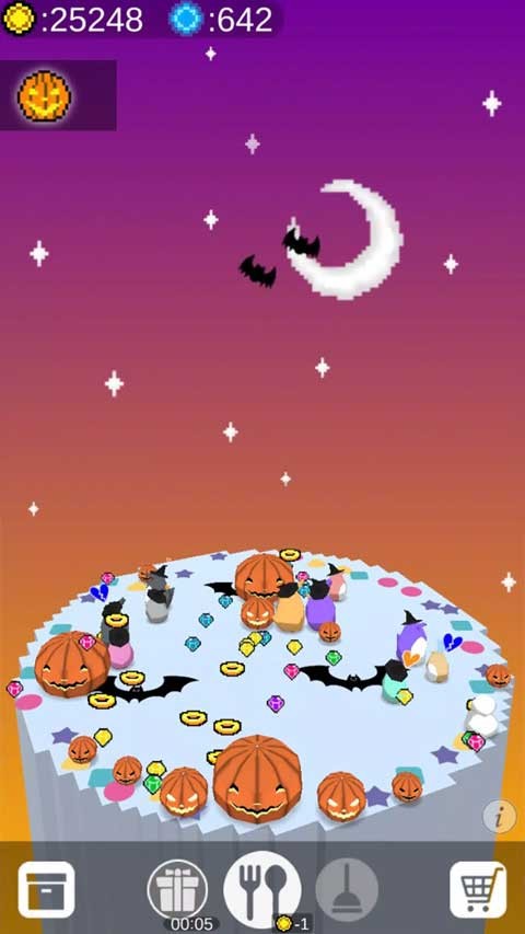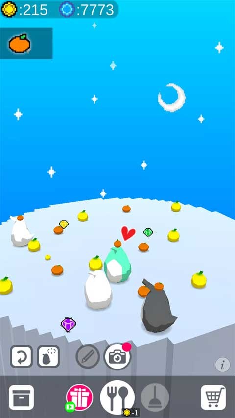 收集资源:这是游戏的核心驱动力。企鹅在进食或闲逛时,会随机吐出各种颜色的宝石。玩家需要及时点击宝石进行收集。宝石是获取金币的主要来源,也是购买高级物品的基础。