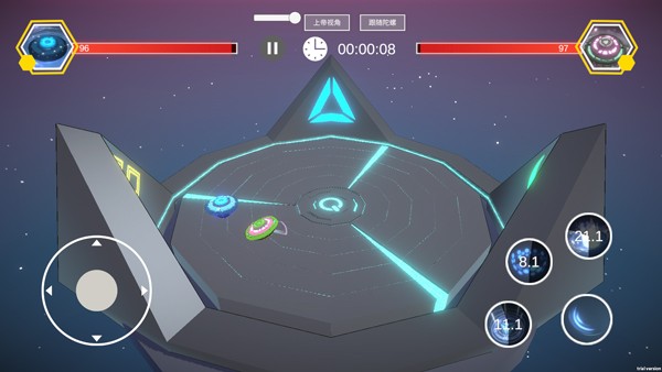 技能释放:屏幕右侧是技能按钮。当能量条攒满时,按钮会高亮显示。点击即可释放陀螺的专属大招,如召唤护盾抵挡伤害或瞬间加速撞击敌人。