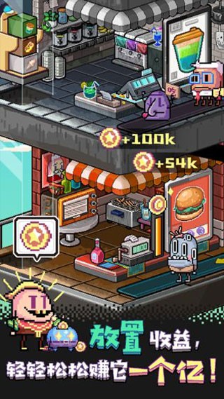 离线流:投资增加离线收益倍数的科技,配合“悲伤紫色小丑”等店长,打造“睡觉也能赚大钱”的挂机体验。