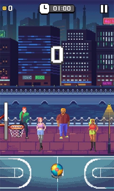 游戏画面采用了经典的像素美术风格。这种风格不仅让游戏包体保持轻量化,更重要的是营造出了一种浓郁的街机怀旧氛围。配合街头篮球的题材,像素风让每一次投篮、每一次篮球撞击篮板的反馈都显得干脆利落,视觉上的“颗粒感”与街头篮球的“粗犷感”相得益彰。