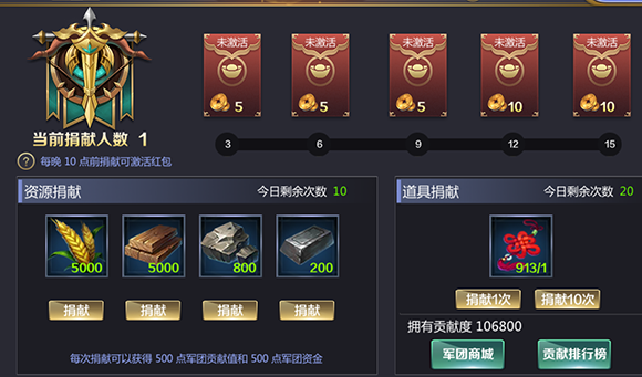 点击捐献对应的资源和道具,即可获得对应的贡献值和军团资金。激活对应的捐献人数即可激活对应的红包。