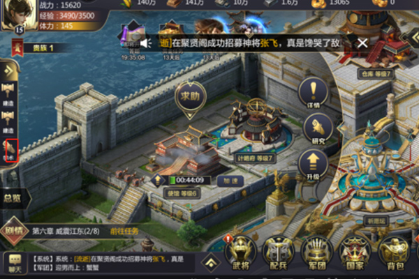 招到强力武将后,升完级带好兵,就可以打神龙塔和梦中三国了,打神龙塔给装备,梦回三国给经验啥的,边打还能边做任务,提升等级,打到打不过了,咱们就升主城,升建筑,做任务领取奖励,建筑等级高,收益和招兵都会更强更多,咱就一句话,跟着主线走!