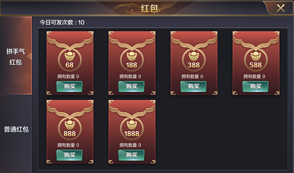 点击消耗对应金币即可购买对应红包,每日上限发10个红包。