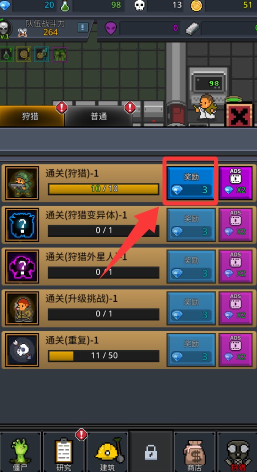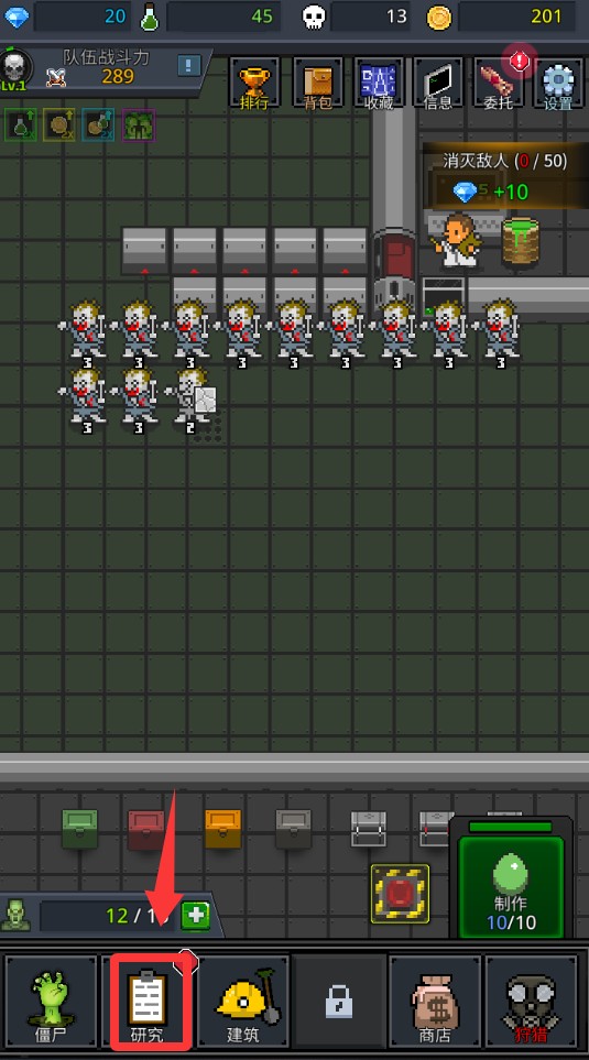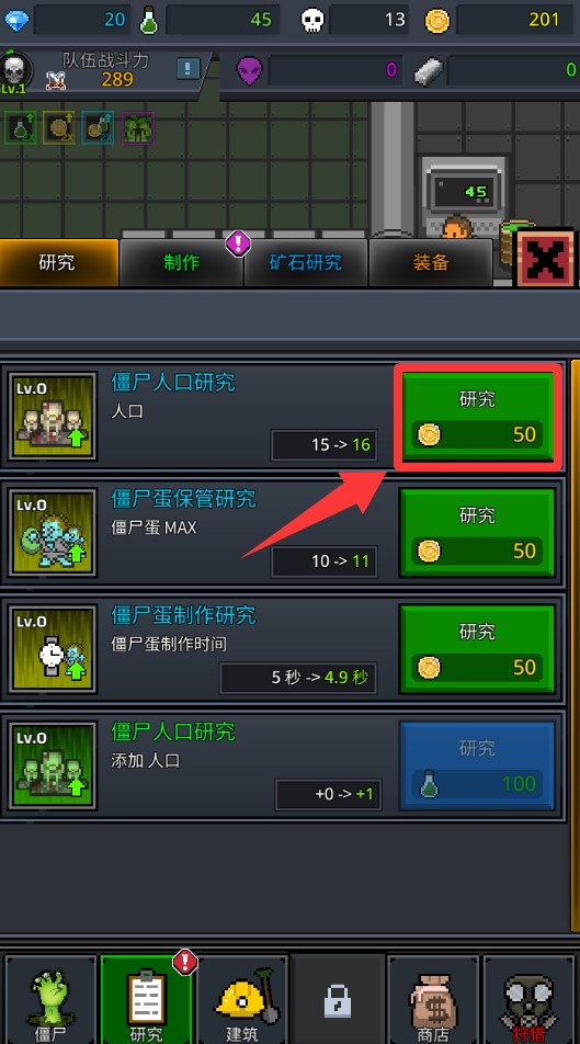 2、点击升级僵尸入口研究里升级。