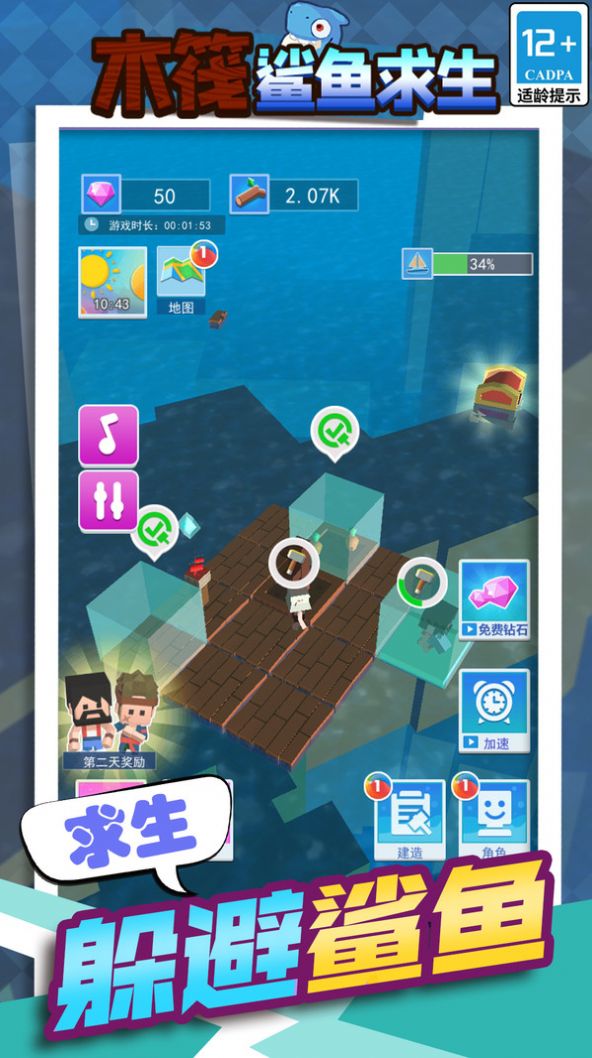 木筏鲨鱼求生是一款卡通风格的战略塔防游戏,通过搜集材料等方法存活下来,通过搭建木筏来提高自己的生存几率,同时也有很多任务要做,比如做饭,修理木筏,还要注意四周,防止被鲨鱼袭击。