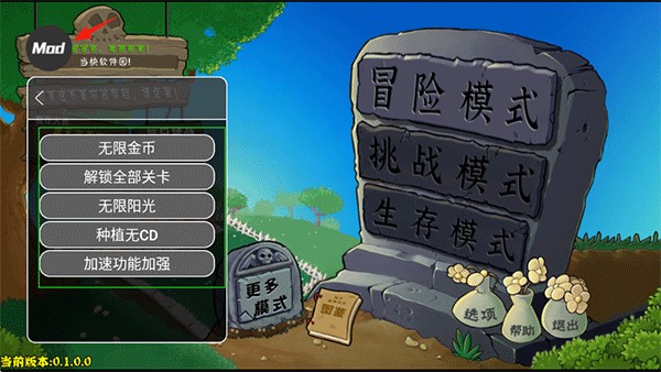 1、在本站下载植物大战僵尸杂交重制版打开,点击Mod菜单开启修改功能,具体可修改功能如下图;
