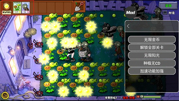 4、开启后可以看到,下方已经显示了植物和僵尸的血量,卡牌UI前置了,左上角无限阳光,种植无CD等;