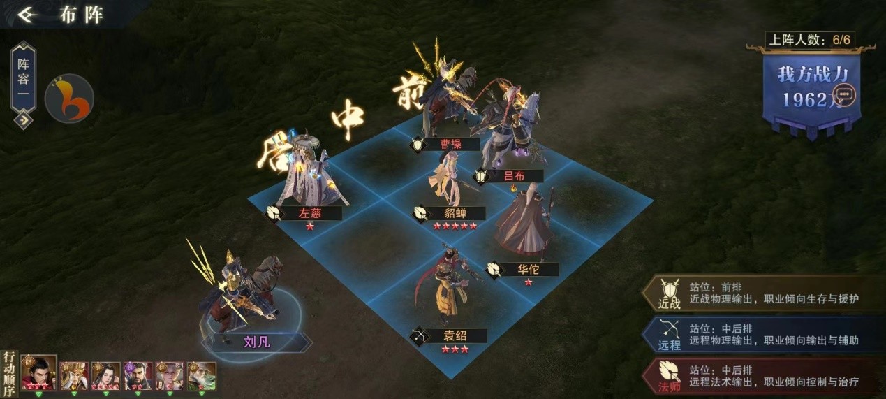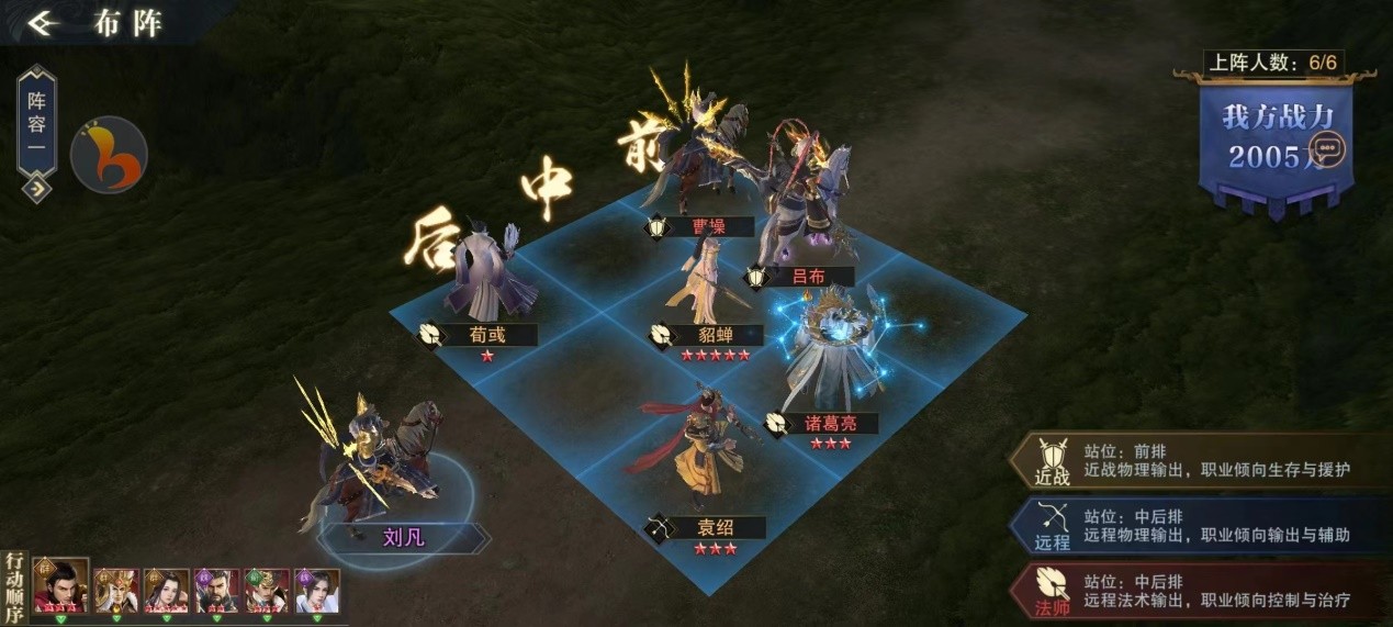 该阵容适合普通玩家,可以迅速成型,阵营招募时可只招募群阵营,以吕布为主力输出,曹操辅助,左慈袁绍控制,貂蝉还可以1v1。