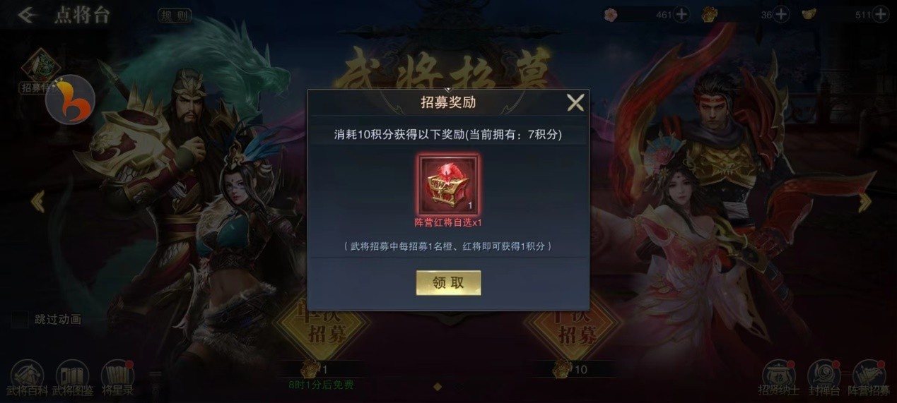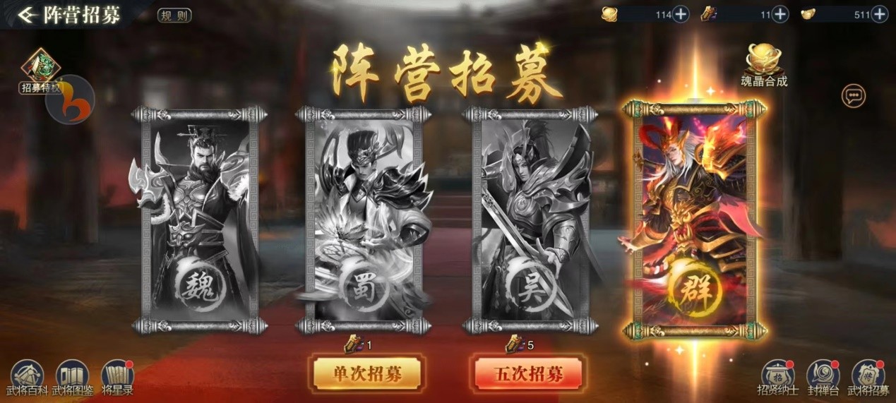 2. 前期阵营红将随机选择,在前期抽取时,大概率随机到为没有的武将,例如你选择的红将为群雄阵容,若已经有左慈,那大概率会出吕布,想出诸葛亮的,可先把关羽免费的得到手再蜀阵容随机。
