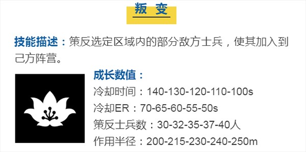 该技能每次策反人数并不是特别多,相对于常规的策反敌方行进路上的士兵为自己增加力量,也很适合在敌方进攻我们建筑物时,且自己据点即将被占领时立即使用,简直是保命神在占领高级据点时(消耗大量士兵),可以估算敌军人数是否足够,掌控好尺度使用可以不费吹灰之力就占领目标据点;同时,当敌方大规模进攻自己的建筑时士气成为我们防守的力量;或进攻敌方时将敌方的补兵作为一份子。