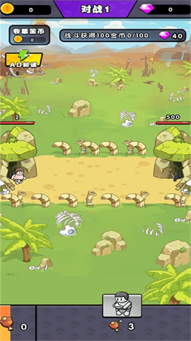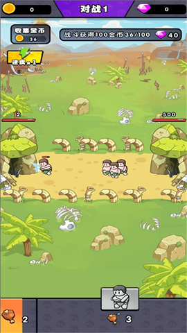 2、原始人士兵会自动前进,去攻击对方的基地,花费金钱可以升级和解锁新士兵。