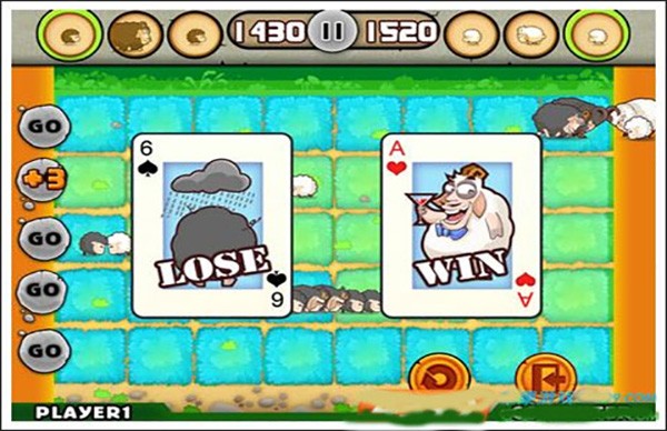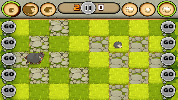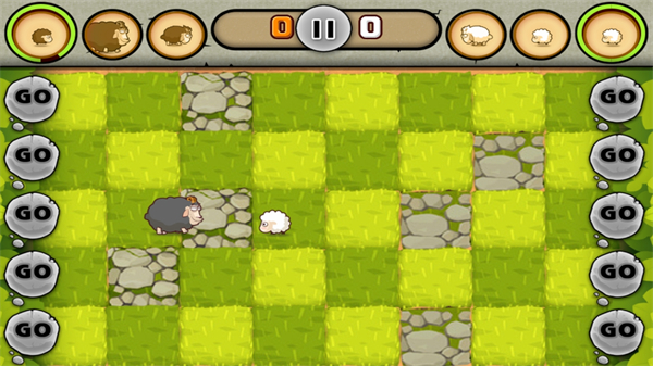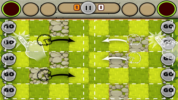 这个模式很容易也富有技巧性,准备前双方将分别位于左右两侧。决斗场中央共五条进攻线路,点击任意一条线路上的“GO”则向该路派遣一只屏幕上方的准备出战的羊。出击中的羊冲到对方的底线则赢得分数,在限定时间内获得分数高的一方获胜。