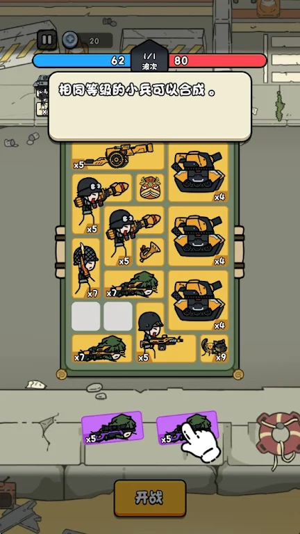 相同的人和武器就能合成更高级的,高级的占据更大,同时威力也越大。