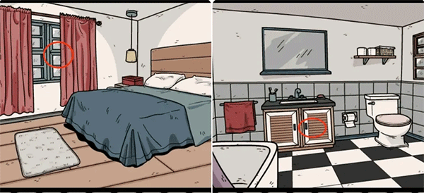 1、卡丽莎视角,观察卧室窗户上的符号,在二楼卫生间的柜子里找到一只收集要素。