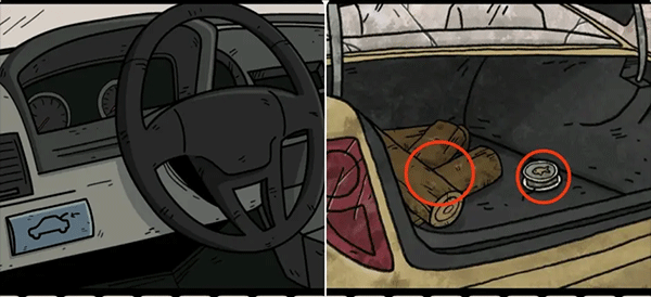 10、到车库用钥匙打开车门并打开后备箱,在副驾驶座位上有第四只收集要素,先根据车库工具墙上工具的形状打开后备箱里的盒子获得红钥匙,再切换到巴斯蒂安拿走后备箱里的木头和鱼线。