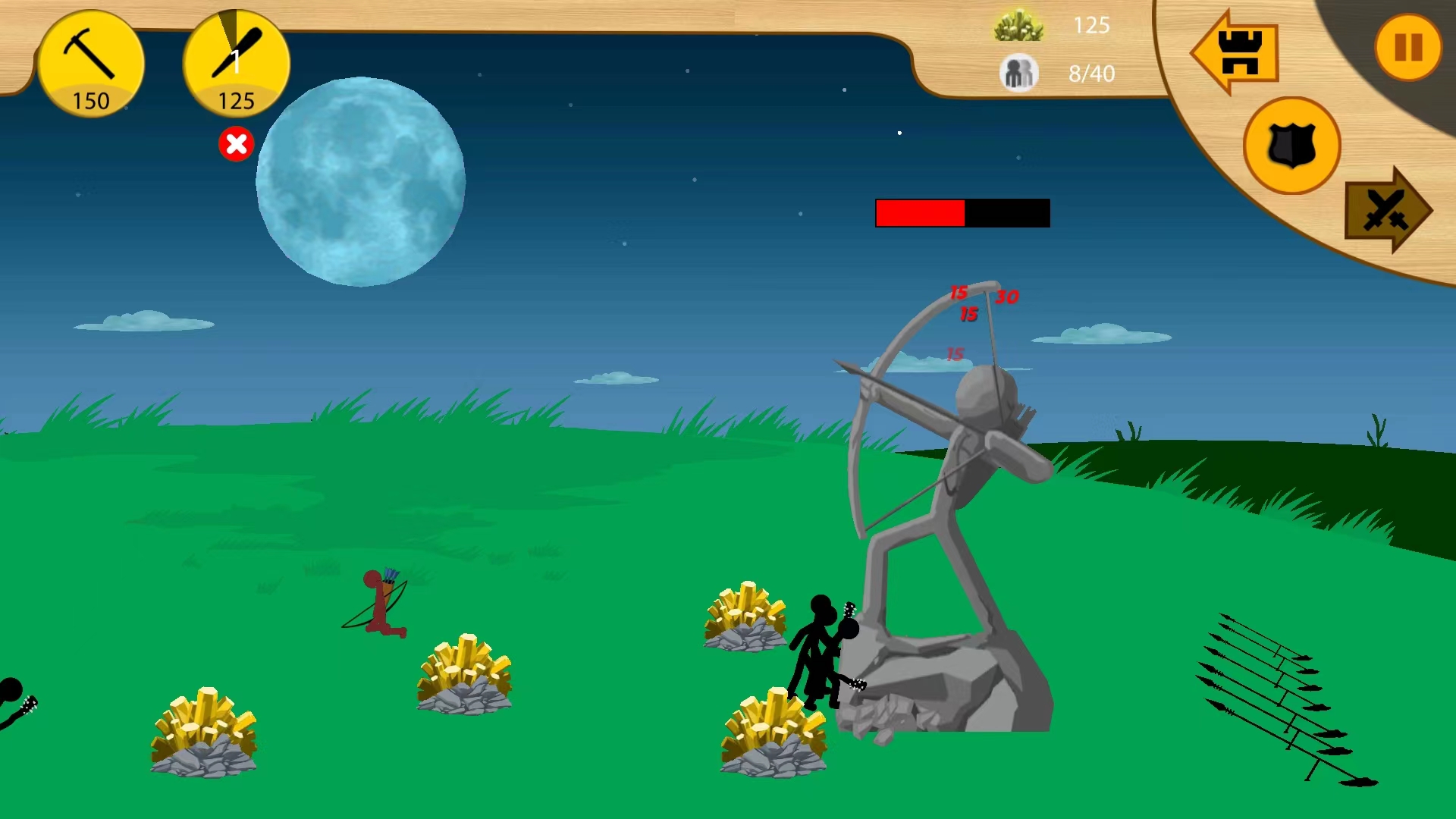 5、我们可以通过左上角来召唤黄金兵和战士,通过右上角前进、暂停和后退来控制我方的战士,