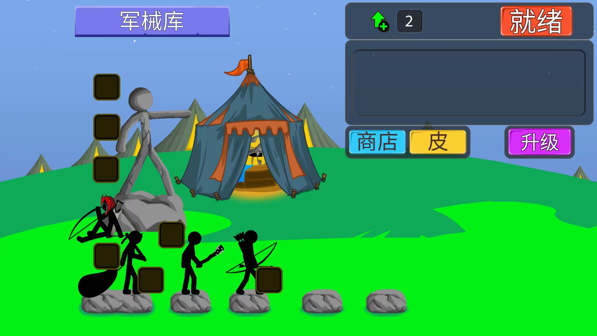 8、在军械库中,我们可以为火柴人装备武器装备,并且通过技能点增强他们的属性,
