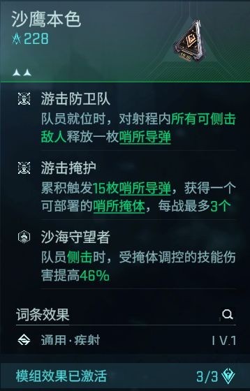 游戏进入第二章后“战术模组”自动解锁,并赠送模组道具“沙鹰本色”,道具给主角安装并达到模组激活要求后,在关卡部署队员时攻击所有具有侧击提示标记的敌人,并提升战斗时对敌人得侧击伤害,还可获得抵挡敌人伤害得四面掩体。