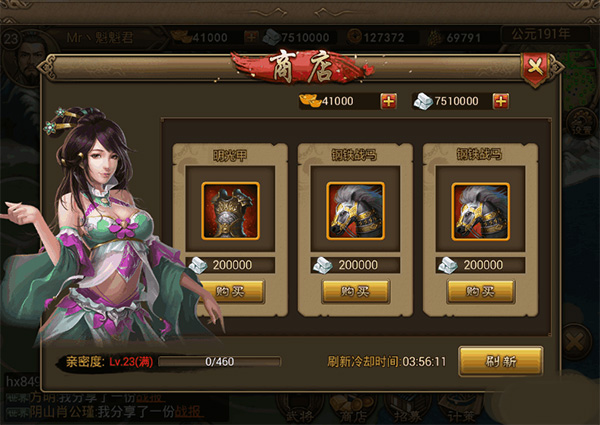5、在等升级时,可以去商店里买一些装备,买到的装备可以给武将们用(每一个将领都可以装上你买的装备)。
