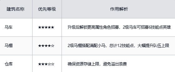 资源分配:石料需求占比60%,木材和铁矿各占20%,优先保证马车和主城升级。