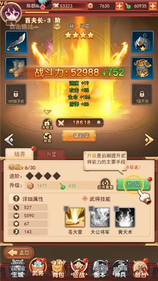5、可以通过升级和穿戴武器装备来提升武将能力。