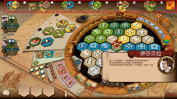 3、游戏共分为五轮(A轮-E轮),每一轮又分为五个回合,每个玩家每个回合都有两颗骰子可以使用。这样一盘游戏下来估计约有共50颗骰子可供使用。玩家操作的顺序按照船的顺位来决定。