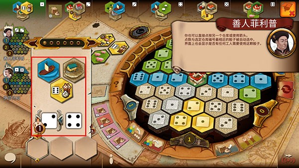 3、你也可以直接点按另一个仓库或使用箭头。点数与选定仓库编号最相近的骰子被自动选中。界面上也会显示是否有任何工人需要使用这颗骰子。