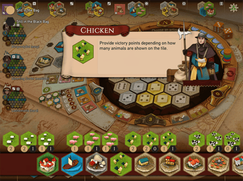 4、实时分:每当一块同种颜色的区域完成后,需要增加两种分数:第一个是目前所在轮数的奖励,第二个是完成的区域内六角片数量(格子)的奖励。当同一种类型的所有区域都完成时会得到一个额外的得分片。这个得分片只奖励前两名最快完成该类型六角片的玩家。另外平时分还包括建筑直接加分、知识片的加分和动物加分。