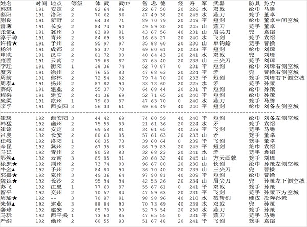 德(人德):数字愈大,在城的指令“收集情报”时愈有效果,而且,敌方武将容易因此变成自己人,只是数值无法做任何改变。