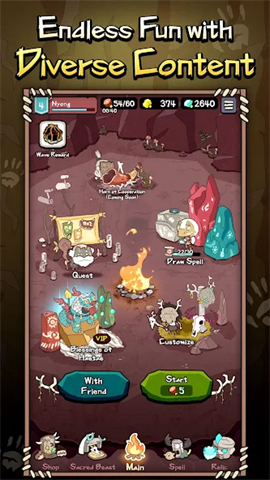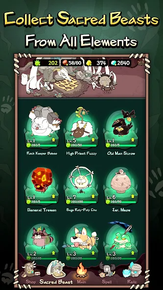 当玩家持有的咒术满足条件时,可以召唤对应的神兽(比如初始神兽汪汪,召唤条件是1级水 + 2级火 + 3级火咒语)