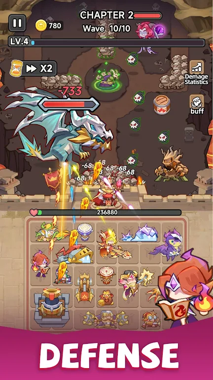 本游戏玩法就是放置策略塔防,玩家需要合理布置英雄来战斗,英雄通过抽取来布置,可以布置合成,解锁更高级的输出能力,对于不同的关卡,玩家需要布置英雄和武器合理的来增加输出,更快的击杀怪物。