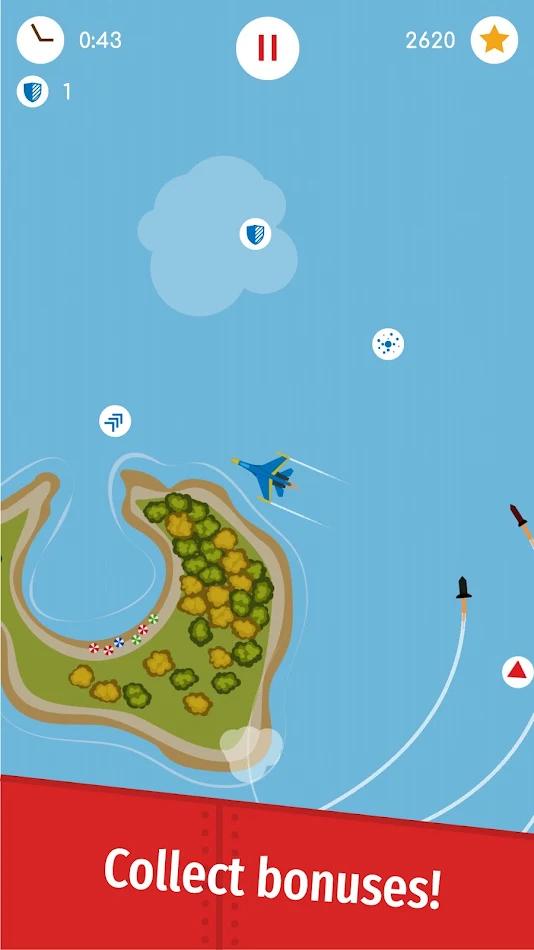 2、控制超过 7 架飞机供您选择,在众多攻击导弹中生存,并收集各种道具,帮助您尽可能长久地生存。