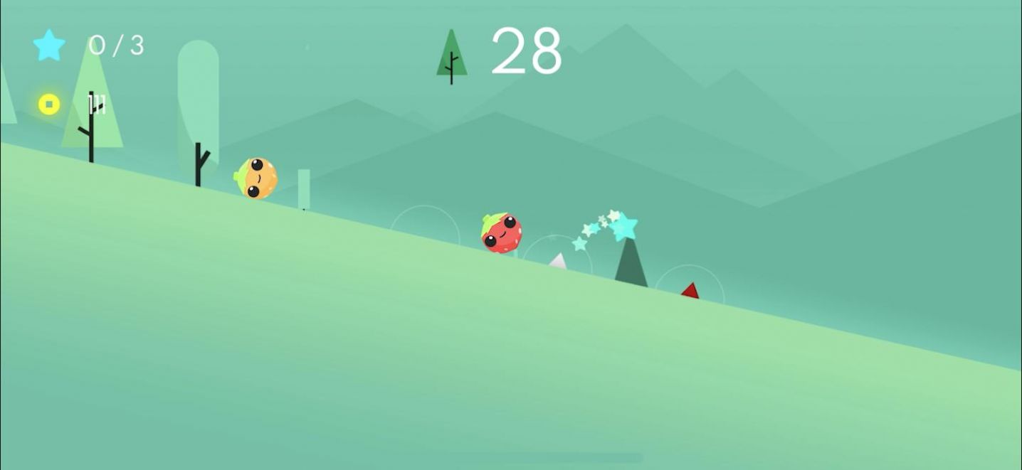 3、各种可爱的水果陪你一起滚下山哦,十分呆萌简单治愈感十足的游戏风格。