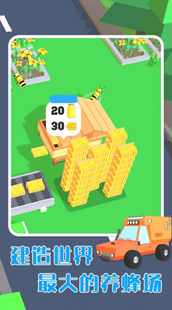 1、一开始只是个小养蜂场。首先,建造一个蜂箱,用蜜蜂来制造蜂蜜,出售蜂蜜来获得收入。