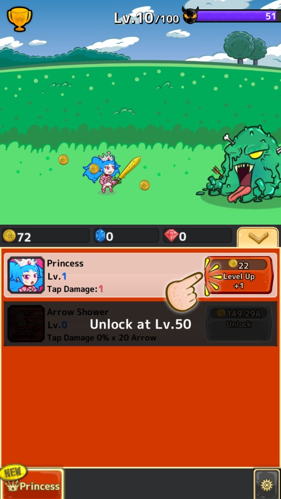 点击公主游戏是一款点击战斗游戏。和公主一起冒险去拯救世界吧!点击屏幕攻击怪兽,击败怪兽会随机掉落金币,用收集的金币来提升公主的等级,还能够用来购买各种道具,虽然冒险的深入我们面对的敌人也会愈发强大,我们可以招募更多的英雄与自己一起战斗,疯狂点击屏幕疯狂攻击敌人,守护王国的和平!