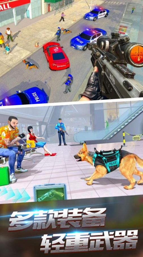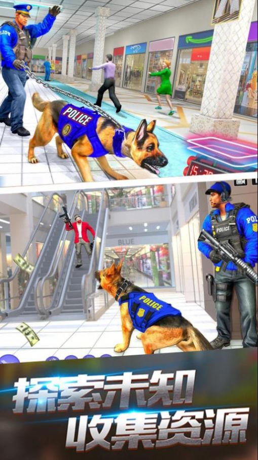 犯罪分子在购物中心抢劫,警察必须与警犬一起履行职责,追捕犯罪和逮捕犯罪分子。