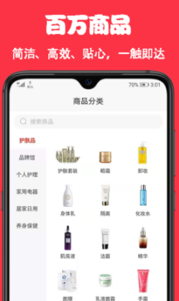2.软件拥有海量的优质商品,商品的种类非常丰富,包括护肤品以及品牌馆还有个人护理以及养生保健的各种商品,同时也有家用电器以及居家日用等等,满足用户的所有购物需求。