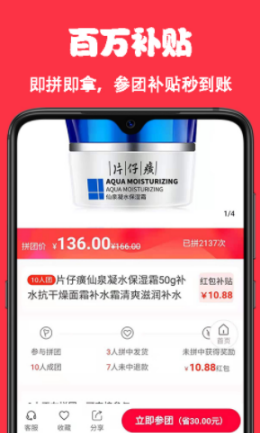 ·百万补贴,优惠折扣,用户可以在软件上参与拼团购物,不仅有着超级优惠的模式也有丰富的补贴折扣,让购物更加优惠。