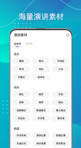 1,里面拥有丰富的演讲素材,拥有万能句可以让你使用,素材在编写过程中能够自由调用。