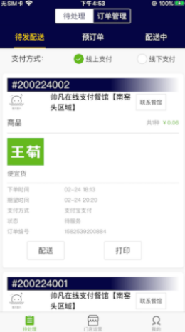 1.软件开发了完善的店铺管理模式,将店铺内所有的代发配送订单以及预订单还有配送中的数据情况进行分类页面管理,用户可以看到所有订单的详细情况,及时进行处理。